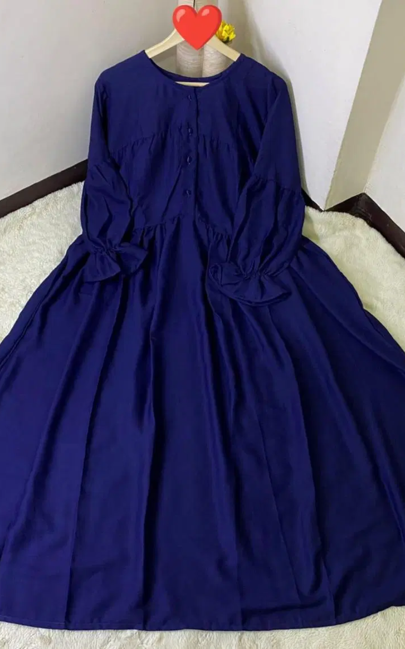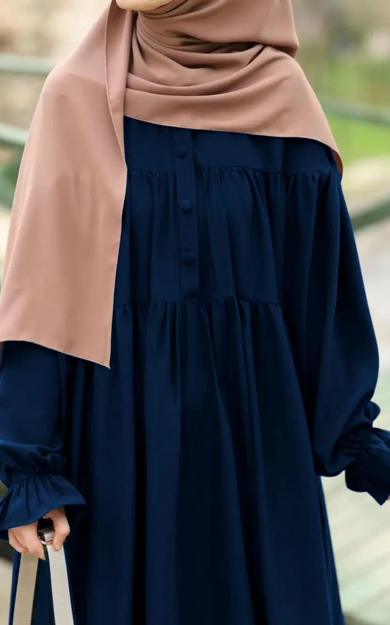 * Material: Georgette * Gender: Women’s * Neck Type: Buttoned Collar * Color: Blue * Package Includes: 1 x Classic Abaya, 1 x Stoller * Chest Size 23 * Abaya Length : 53/54 * Flare 100 inch